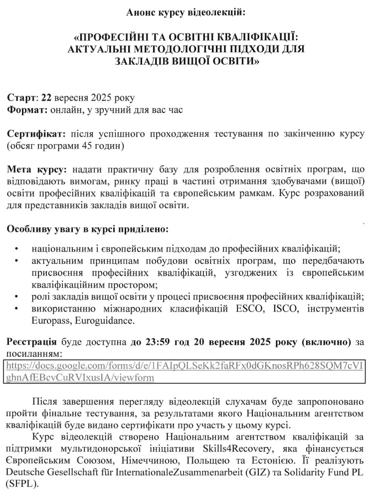 Відеокурс «Професійні та освітні кваліфікації: актуальні методологічні підходи для закладів вищої освіти»
