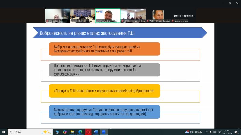 12 листопада 2025 року директор Навчально-наукового інституту забезпечення якості вищої освіти Олена Гасій взяла участь у відкритому заході, присвяченому темі етики використання генеративного штучного інтелекту (ГШІ). Дискусія під назвою «(Не)етичний ШІ» відбулася на базі Дніпровського державного університету внутрішніх справ і зібрала представників академічної спільноти та експертів з питань доброчесності.