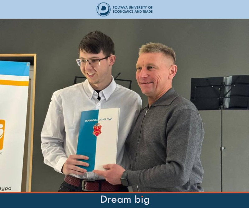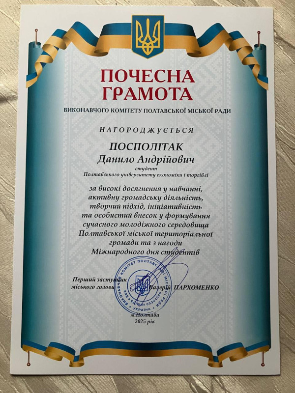 Посполітак Данило – студент 3 курсу, освітньої програми «Підприємництво, торгівля та логістика нагороджений Почесною грамотою виконавчого комітету Полтавської міської ради.