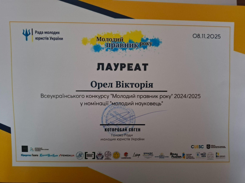 Вітаємо Вікторію Орел, старшого викладача кафедри правознавства Полтавського університету економіки і торгівлі, Лауреата Всеукраїнського конкурсу “Молодий Правник Року” 2024/25 у номінації «молодий науковець»!