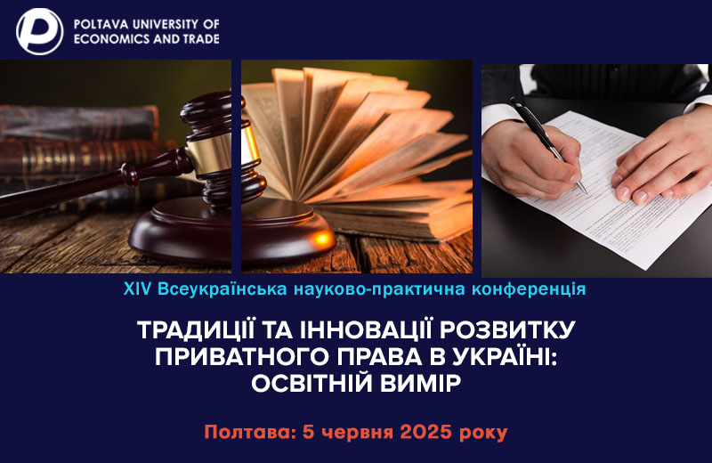 Запрошуємо Вас взяти участь у роботі ХІV Всеукраїнської науково-практичної конференції «ТРАДИЦІЇ ТА ІННОВАЦІЇ РОЗВИТКУ ПРИВАТНОГО ПРАВА В УКРАЇНІ: ОСВІТНІЙ ВИМІР» (з дистанційною участю), яка відбудеться у Полтавському університеті економіки і торгівлі 05 червня 2025 року