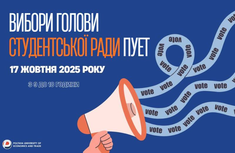 17 жовтня 2025 року запрошуємо всіх студентів взяти участь у виборах голови Студентської ради університету з 9 до 18 години.