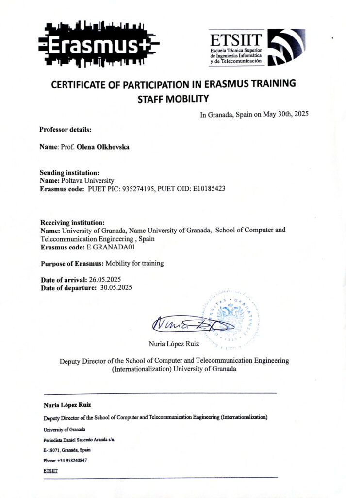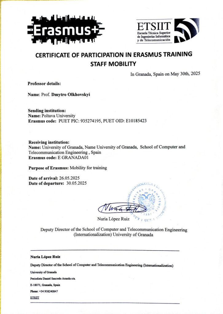 У період з 26 по 30 травня 2025 року викладачі кафедри Комп’ютерних наук та інформаційних технологій Полтавського університету економіки і торгівлі – Кошова Оксана, Ольховський Дмитро та Ольховська Олена – взяли участь у міжнародній академічній мобільності в межах програми Erasmus+ KA1 в одному з провідних вищих навчальних закладів Європи – Університеті Гранади (Королівство Іспанія).