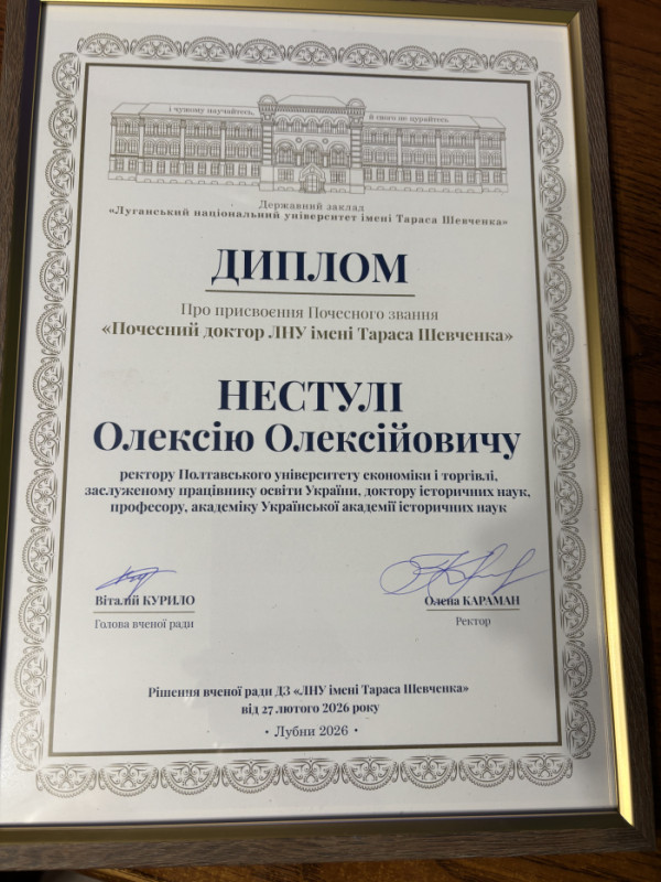 Полтавський університет економіки і торгівлі щиро вітає ректора, доктора історичних наук, заслуженого працівника освіти України, академіка Української академії історичних наук, професора Олексія Олексійовича Нестулю з високим визнанням його наукових та освітянських здобутків.