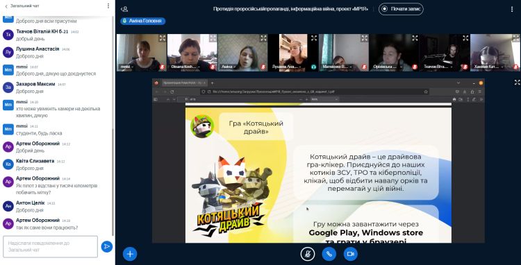 Студенти освітньої програми «Комп’ютерні науки» освітнього рівня бакалавра та магістра доєдналися до відкритої онлайн лекції «Протидія проросійській пропаганді, інформаційна війна, проект «МРІЯ». Спікер – Головня Аміна, інспектор відділу протидії кіберзлочинам в Полтавській області Департаменту кіберполіції Національної Поліції України. Ця зустріч стала можливою за тісної співпраці і сприяння Департаменту кіберполіції НП України та кафедри Комп’ютерних наука та інформаційних технологій для студентів освітньої програми «Комп’ютерні науки». Здобувачі освіти активно долучилися до обговорення, задавали актуальні питання сьогодення щодо протидії проросійській пропаганді та питання інформаційної війни.