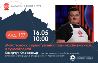 В рамках марафону з якості в ПУЕТ учасник шоу-програми «Майстер-шеф», випускник – магістр 2024 р. спеціальності 181 Харчові технології Козярчук Олександр проведе майстер-клас з приготування страви української кухні в сучасні подачі. Олександр ознайомить з особливостями кухні Західних регіонів України та поділиться враженнями про участь в кулінарному шоу. Дата 16.05. 2024 Час 10.00-12.00 Місце ауд. 107. […]