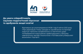 Відповідно до розпорядження №28-У від 9 квітня 2021 року «Про реалізацію Плану заходів по запобіганню та протидії корупції» просимо ознайомитись із Пам’яткою щодо попередження корупційних правопорушень у Вищому навчальному закладі Укоопспілки «Полтавський університет економіки і торгівлі». Наголошуємо, про необхідність неухильного дотримання Закону України «Про запобігання корупції» та Антикорупційної програми ПУЕТ. Уповноважена особа з питань запобігання та виявлення […]