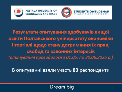 Результати опитування здобувачів вищої освіти Полтавського університету економіки і торгівлі щодо стану дотримання їх прав, свобод та законних інтересів (опитування проводилось з 21.05. по 20.06.2024 р.)