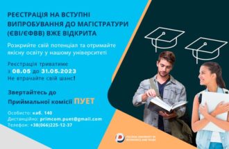 Розкрийте свій потенціал та вступайте до магістратури! Період реєстрації: 08.05 – 31.05.2023 Не пропустіть цю унікальну можливість розвинути свої знання та отримати високоякісну освіту у нашому університеті. Ми пропонуємо широкий спектр програм, які допоможуть вам досягти професійного зростання. Чому варто вступати до магістратури в ПУЕТ? Висококваліфіковані викладачі та наукові кадри Сучасне оснащення та лабораторії Можливість […]